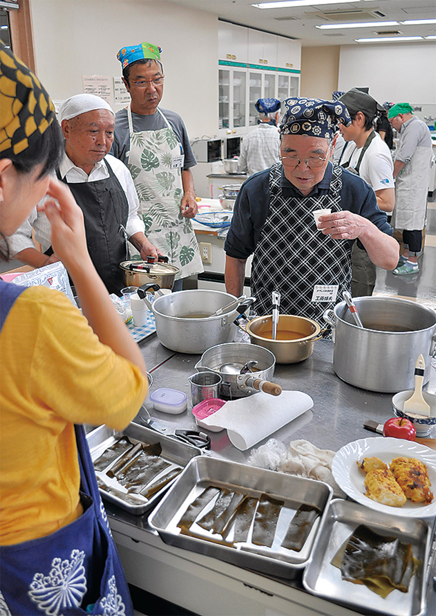 男性が対象の料理教室は10年以上続く人気の催しという。この日の参加者は鮭のホイル焼きや肉じゃが、だし巻き玉子、お吸い物などの和食を作り味わった。