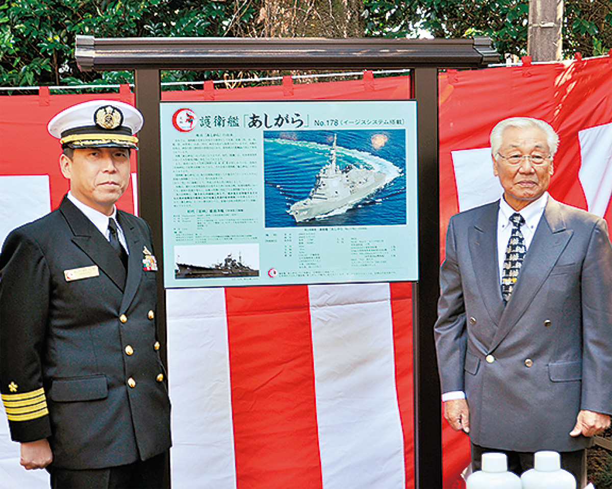 海上自衛隊イージス艦「あしがら」の就役10年を奉告する祈願祭と、市内の篤志家が奉納した案内板の除幕式が2日、南足柄市苅野の足柄神社で行われた。