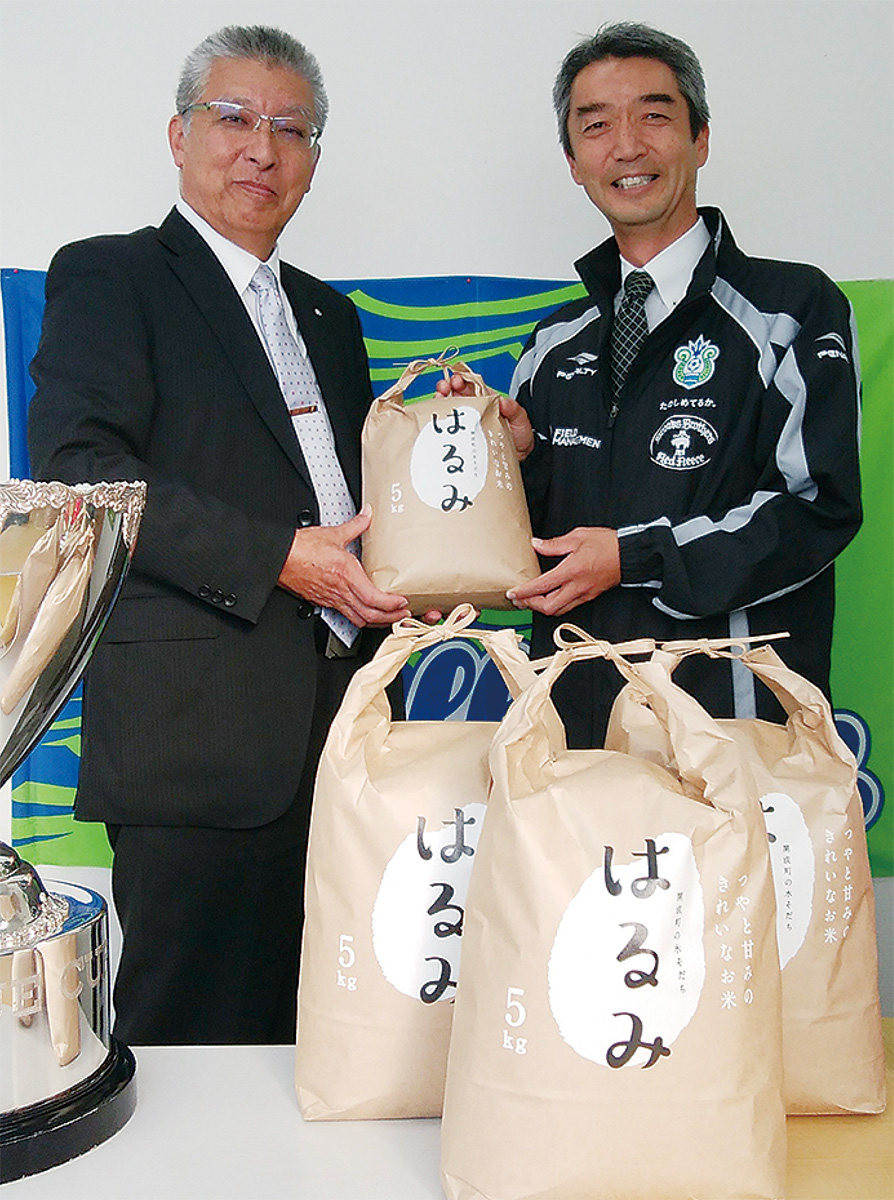 今月8日には、サッカーJリーグでクラブ創設以来初のカップ戦優勝を果たした湘南ベルマーレの本社(平塚市中堂)を府川裕一町長が訪問し、優勝祝いとして開成町産の「はるみ」30キロを贈呈した。