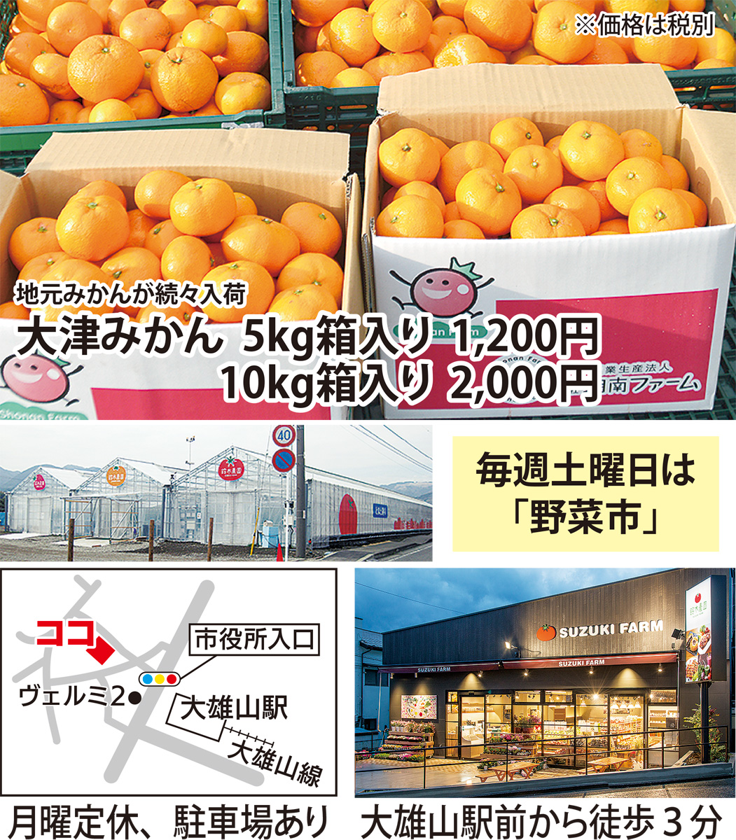 全国14カ所に農園や集荷場、加工工場を持つ鈴木農園グループ(本社・南足柄市)が、大雄山駅前の直営店『鈴木農園』できょう12月8日(土)と9日(日)の2日間、“冬の大収穫祭”を開催する。