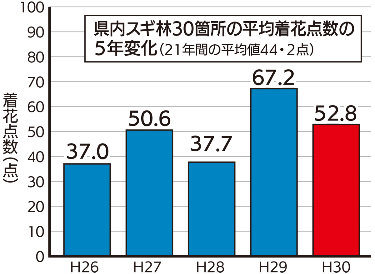 4地域の平均着花量は例年よりおよそ2割多かったが、昨年よりも2割程度少なく、県全体の飛散量は「やや多い」と予測された。