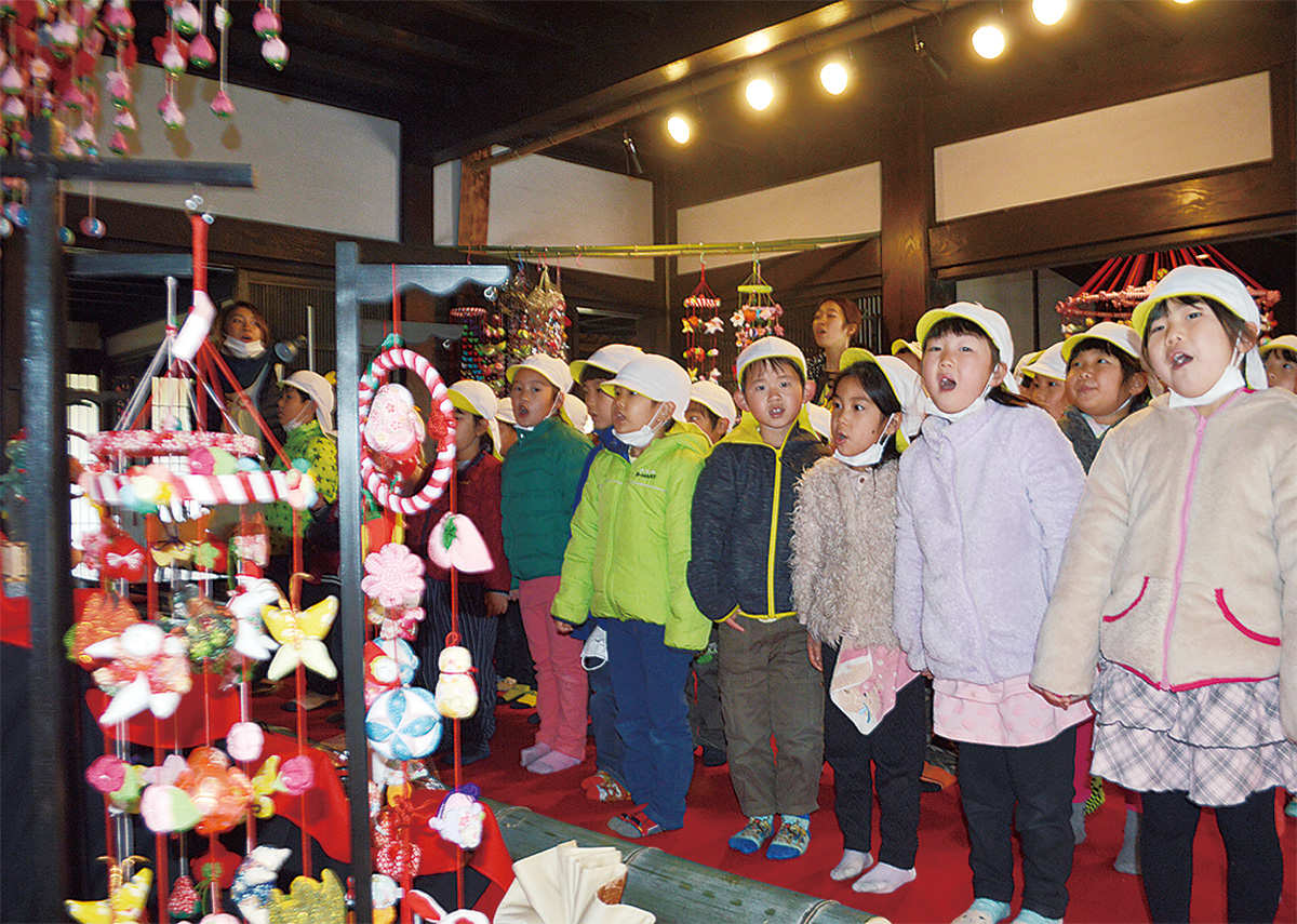つるし雛の説明では、「とうがらしは虫が嫌う。悪いものから守ってもらえるように、の願いが込められている」などと一つひとつの由来を説明。園児たちはお礼に童謡「うれしいひなまつり」を大きな声で歌った。