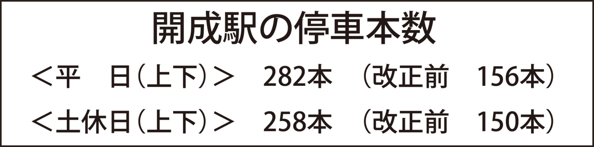 ダイヤ改正により、開成駅への停車本数は、平日(上下)156本から282本に、土休日(上下)は150本から258本に大幅に増える。