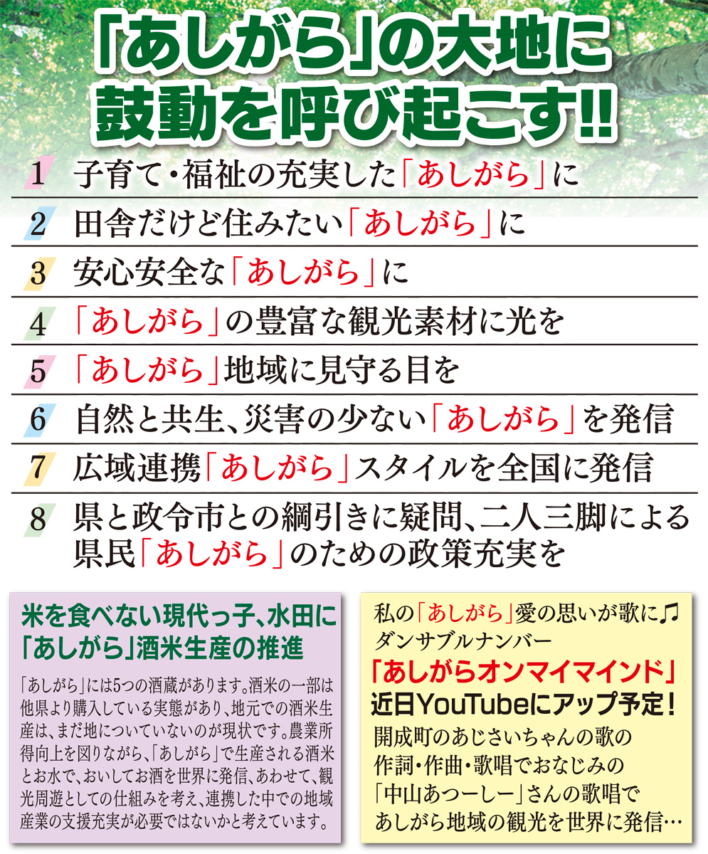 私「山田たかひろ」は、声を大にして言いました。「あしがらが大好きだ」と。雄大な自然と共生、豊富な観光素材、災害の少なさ、挙げればキリがないほど魅力的です。酒蔵が5つもあるなんて、とても素敵な環境だと思います。