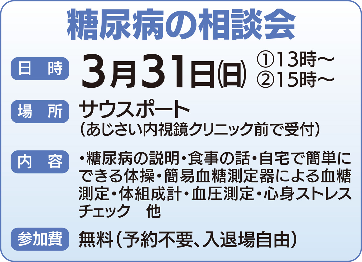 新体制を記念して、前日の3月31日(日)に「糖尿病の相談会」を開催する。時間は、午後1時からと3時からの2回。