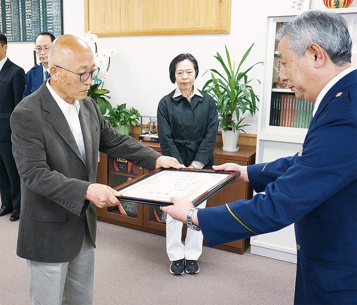 松田警察署は4月9日、西丹沢ユーシンロッジ付近で行方不明となっていた37歳男性を発見し、必要な救護措置及び救助要請を行い、遭難者の人命救助に多大な貢献をしたとして、町田町在住の丸山和之さんに感謝状を贈呈した。
