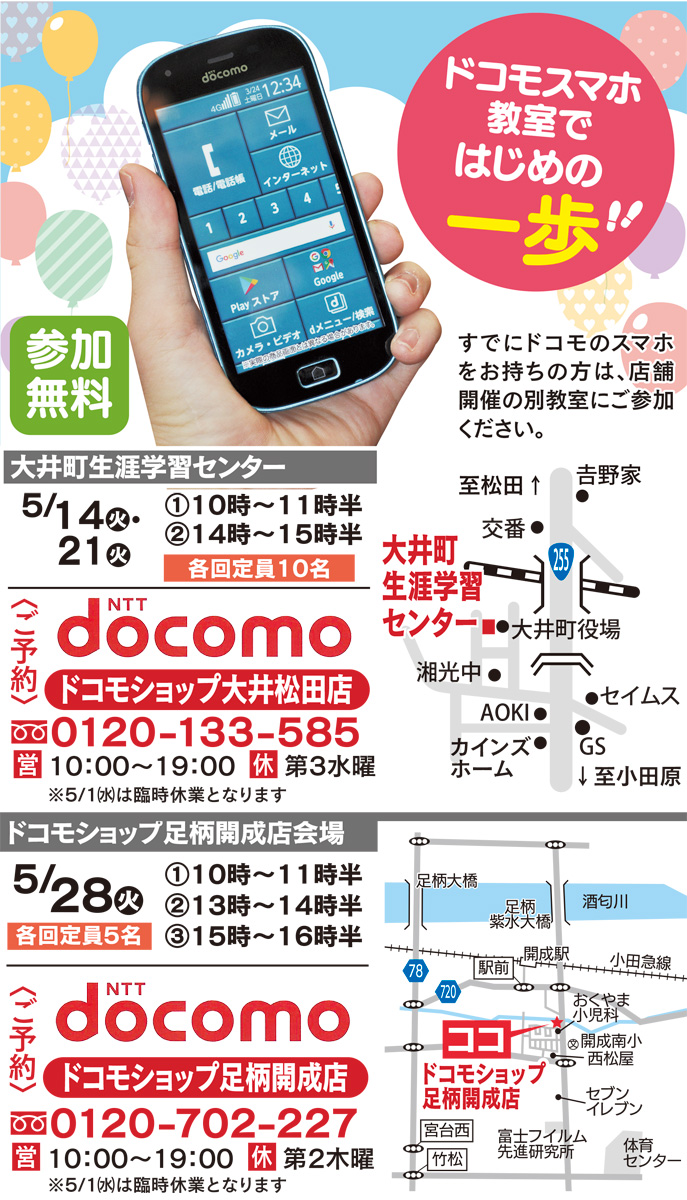 5月は大井町生涯学習センターの他、ドコモショップ足柄開成店の店内でも開催。新時代のチャレンジで、スマホのある暮らしを叶えよう。