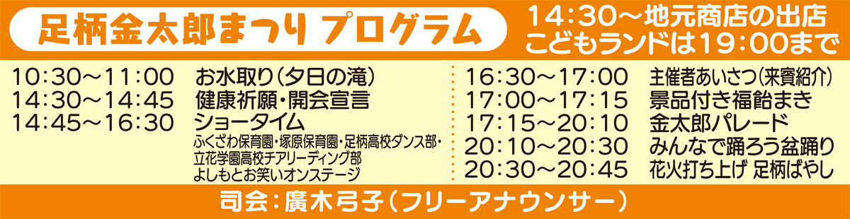 地元の保育園児や足柄高校ダンス部、立花学園チアリーディング部、よしもとお笑いオンステージなどが開催される。午後5時からは景品付き福飴まき。夕方からは恒例の金太郎パレード。飯沢交差点、中沼交差点から祭り会場へと続く道のりを練り踊る、市民と複数の金太郎ねぶたと、神輿ねぶたが神輿と競演する姿は圧巻。
