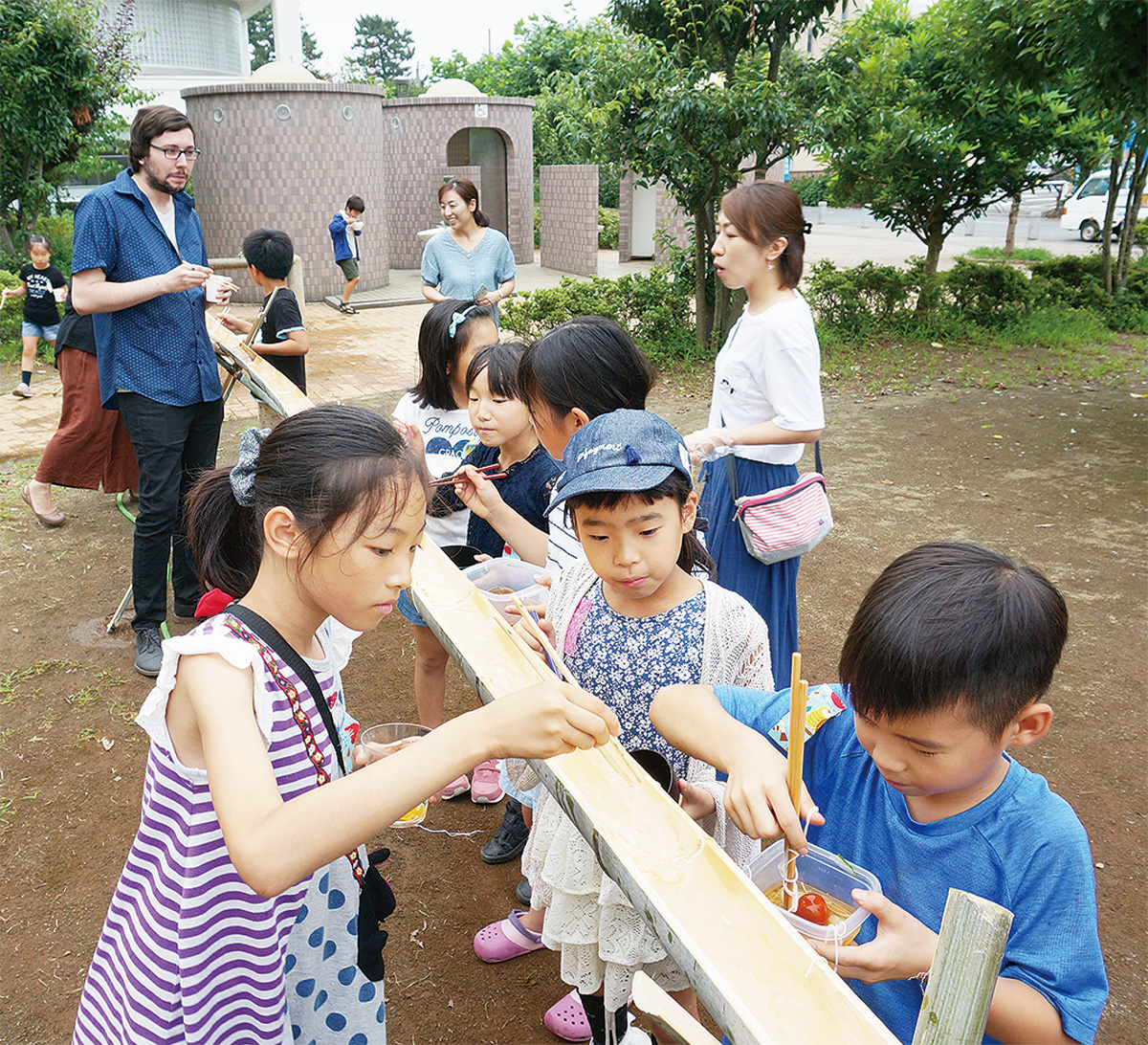 取材日の7月22日は、事前申し込みの段階から大人気だったという「流しそうめん」。子どもたちは25人の参加だったが、多くの保護者らの参加で、そうめんを茹でたり流したりとのヘルプも充実。差し入れもあり、野菜やフルーツも流されるなど、子どもたちは大喜びだった。