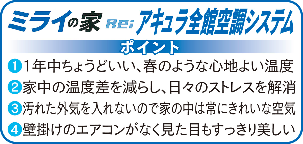 標準装備の「アキュラ全館空調システム」では、小屋裏の空調機から家中に心地よい空気を循環。家族が集うリビングからキッチン、廊下や子ども部屋まで24時間365日快適な室温を保つ。冬場は、足元に届きにくい暖気を床下から送ることで足元からじんわり暖めるのも特長だ。気になる冷暖房費も太陽光発電の活用で0円を実現する。