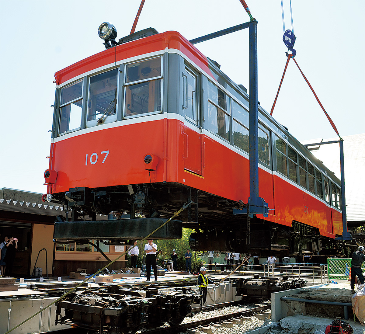 小田原市風祭の鈴廣かまぼこの里に8月9日、7月に引退した箱根登山鉄道のモハ1形107号が登場。クレーン車で吊り上げられ、9月8日(日)にグランドオープンする「えれんなごっそCAFE107」の前に、約2時間かけて設置された。1ミリの狂いのない操作技術に、現場を見守っていた関係者らから大きな拍手が上がった。