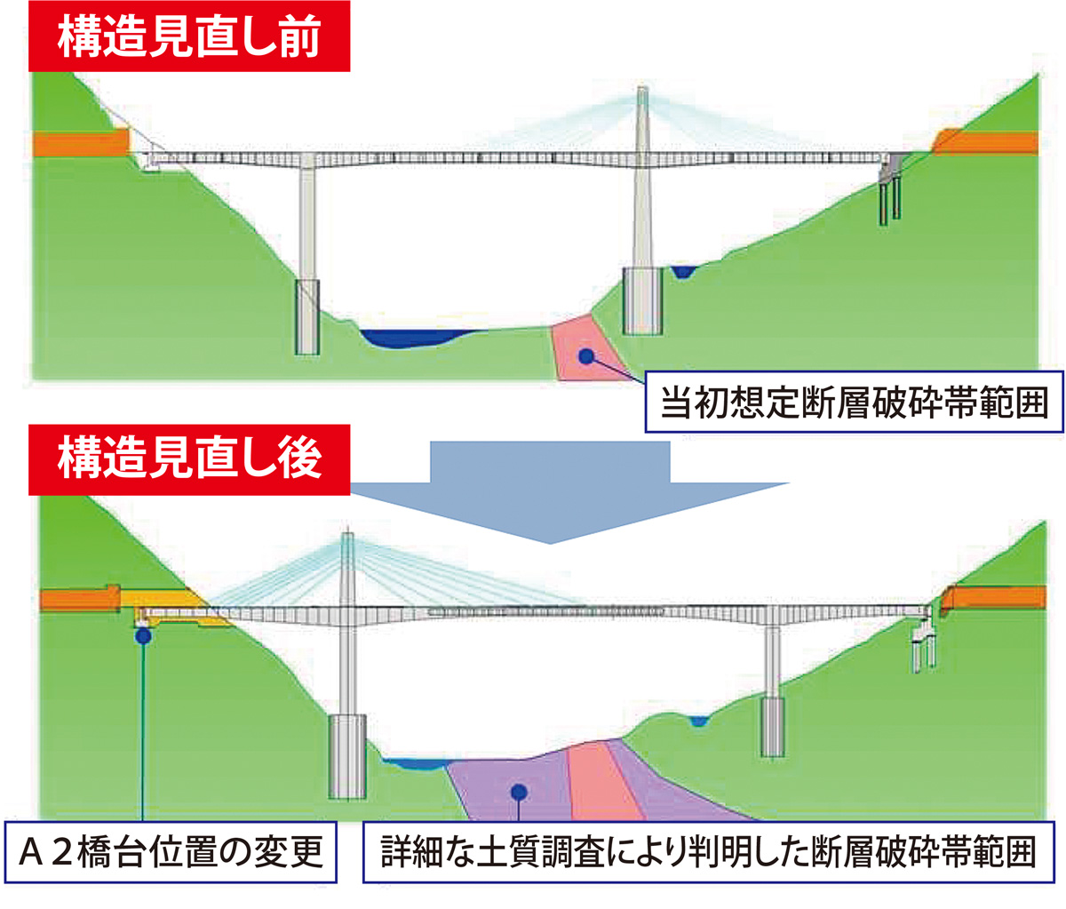 また、橋梁構造形式の変更については、詳細な地質調査を行った結果、断層破砕帯が想定以上の広範囲であったことが判明。断層を避けた位置に下部工を配置するなど、構造見直しの必要に迫られた。
