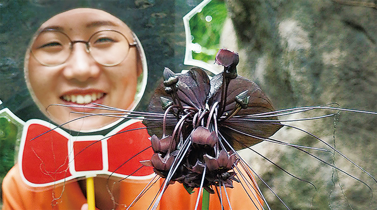 猫の目に見える中心部の「花」、耳のような「苞葉(ほうよう)」、ひげに見える「未発達の花茎(かけい)」とユニークな形状に、「ブラックキャット」の異名を持つ珍しい花。同園では昨年からSNSなどの撮影用に黒猫の顔パネルも用意し、来園者を楽しませている。スタッフの中西七緒子さんは「7月の開花から今年は長く持っています。お気に入りの『1匹』と撮影を」と話している。