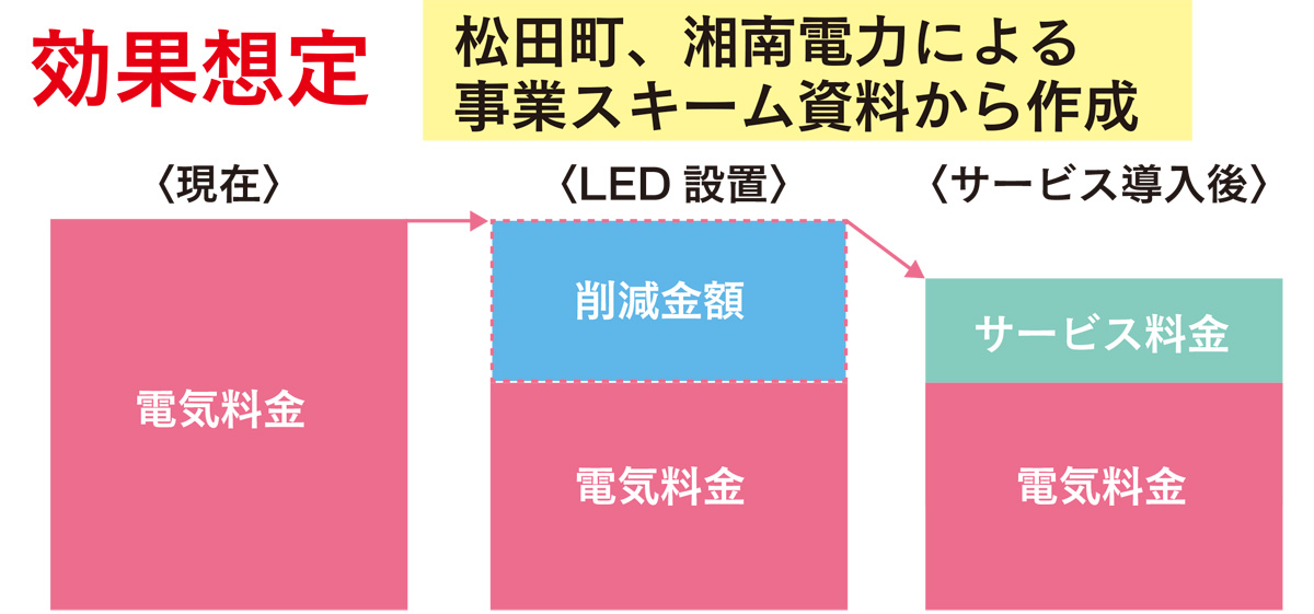 事業の仕組みは、LED照明の設置と保守を湘南電力が行い、町は電気料金とサービス料金を同社に支払う。LED照明機器は、ほうとくエネルギー株式会社(小田原市扇町)が購入したものを湘南電力にリースする。契約期間は10年間。
