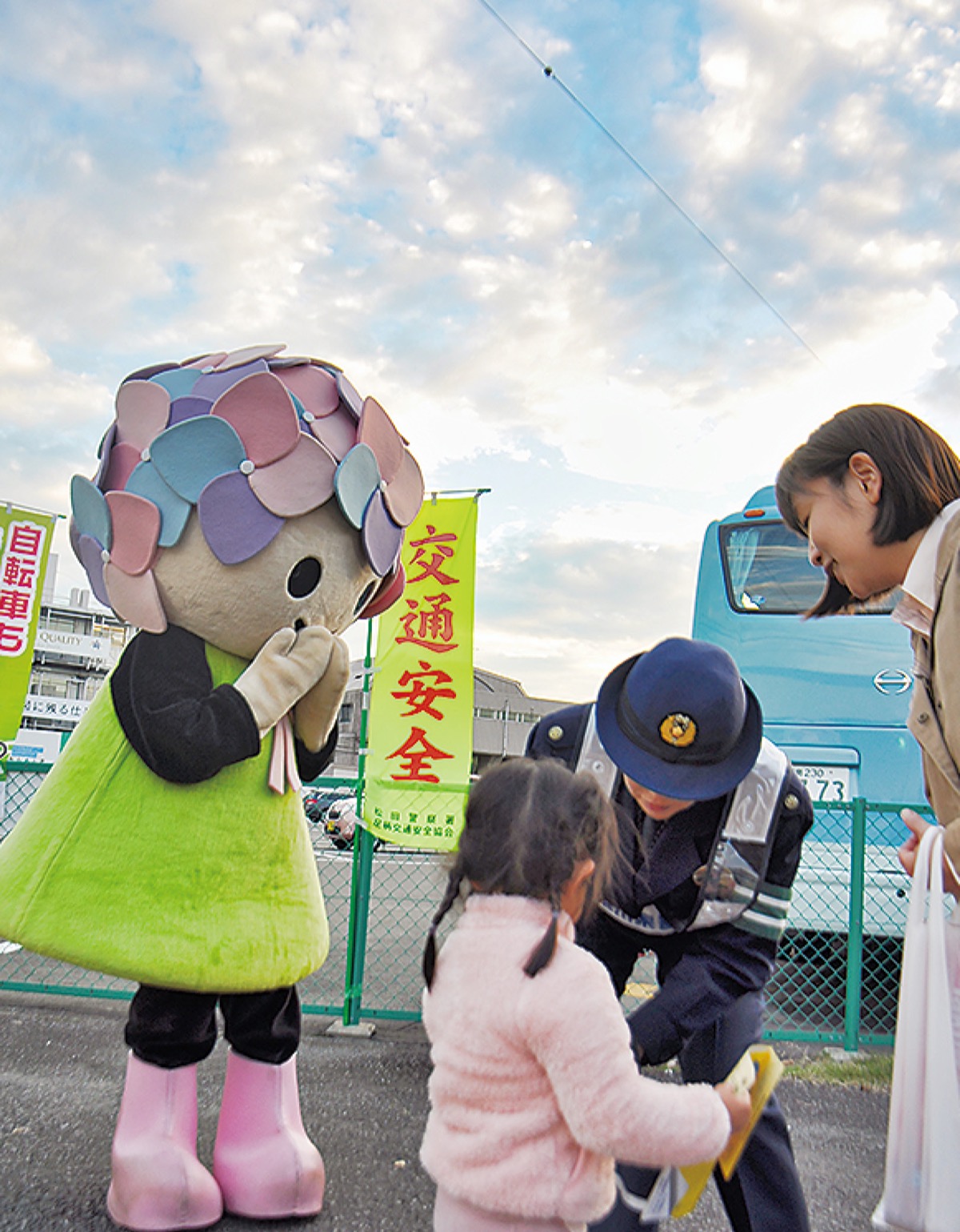 当日は、松田警察署員と開成町職員、開成町交通指導員ら約15人に加え、同町のマスコットキャラクターあじさいちゃんも駆け付けた。参加者らは交差点を行き交う通行人に啓発品を手渡し、ライトの早めの点灯や運転中のスマートフォンやイヤホンの使用禁止などのルールとマナーを呼びかけた。子どもたちはあじさいちゃんから啓発品を受け取ると「気を付けて運転します」と笑顔で「交通安全」を宣言していた。