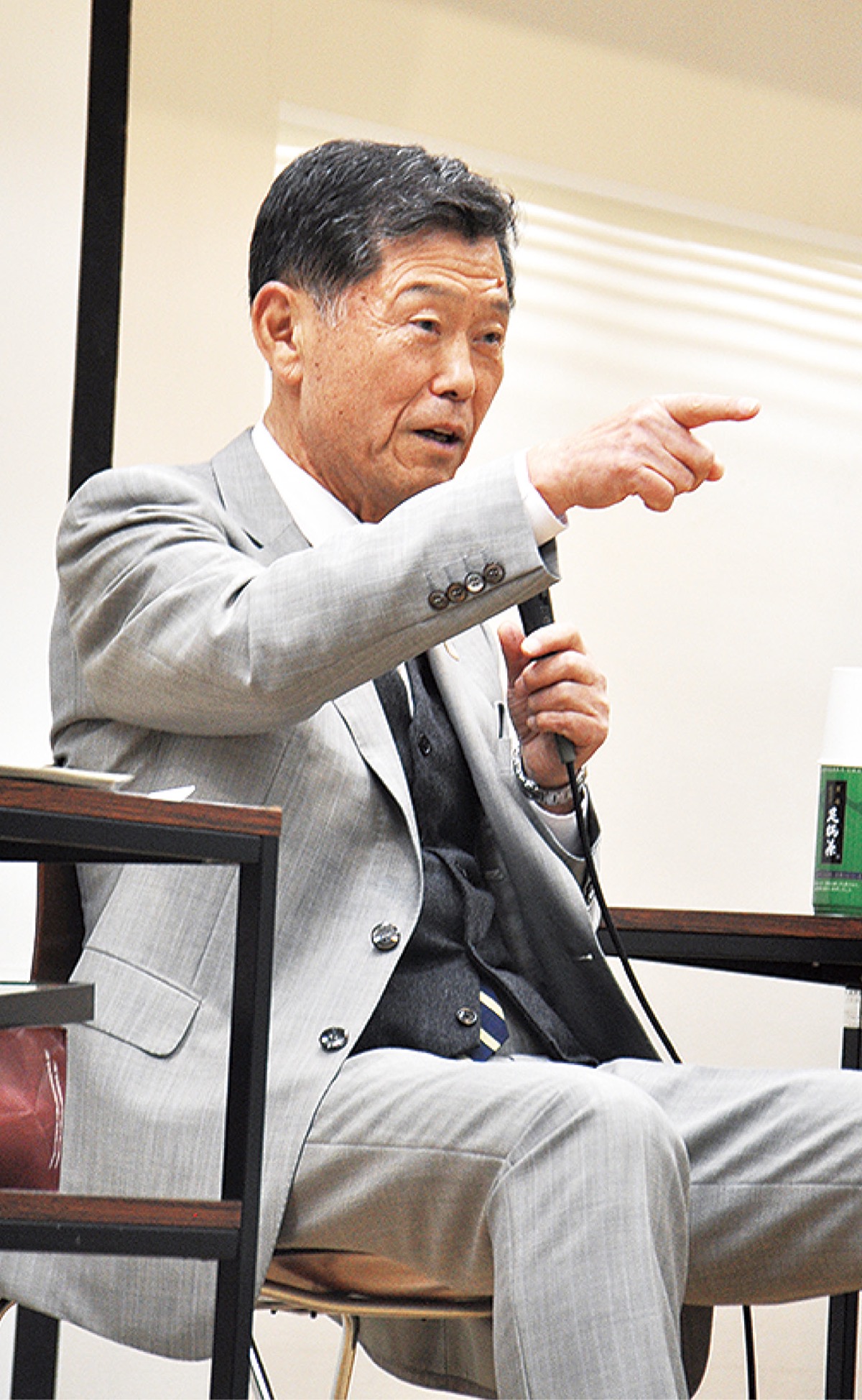 横浜高校硬式野球部元監督で松田町ふるさと大使を務める渡辺元智さんと次女で同校の寮母として20年間選手たちを支えた元美さんの親子対談が12月21日、松田町民文化センターで行われた。