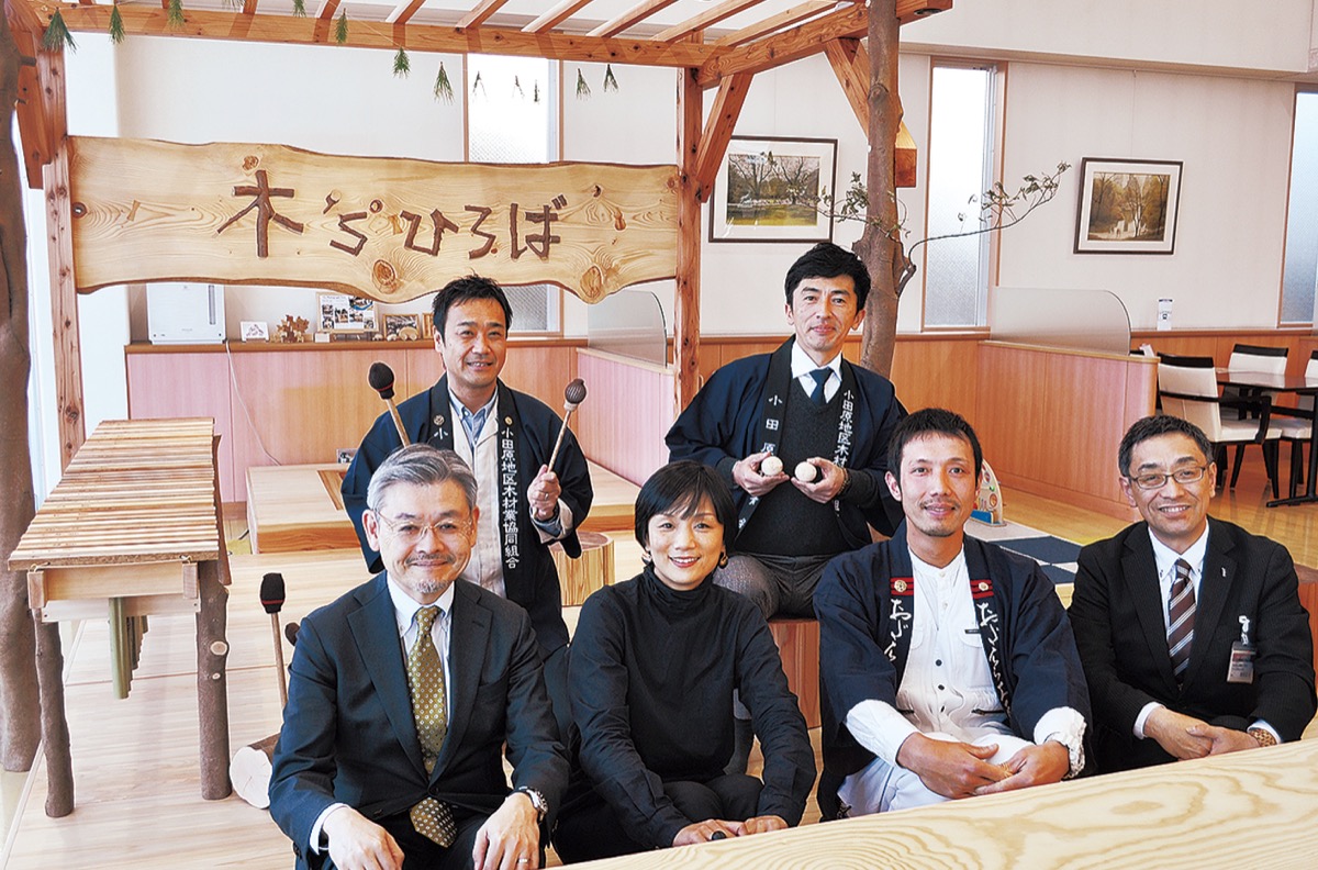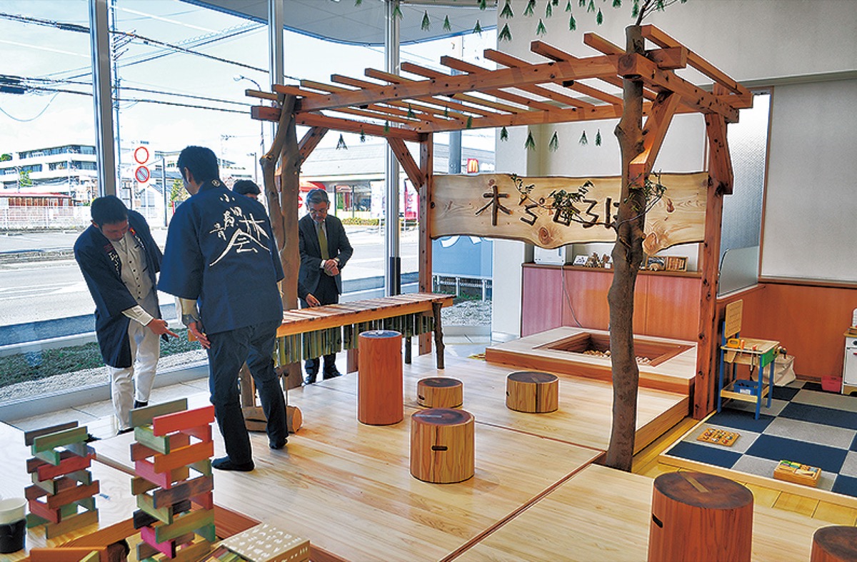 ネッツトヨタ神奈川(株)ウエインズ255上大井店の店内にこのほど地元小田原産の木材を利用した憩いのスペース「木's(きっず)ひろば」が完成した。
