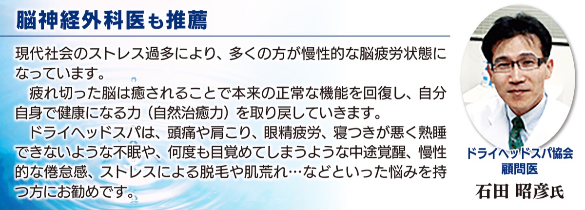 「ヘッドスパなんて上手に頭を洗うだけの技術じゃないの?」そう思われているお客様は、まだまだ少なくありません。でも、ヘッドスパには学校というものまであるんです。私が2019年に通っていたのは、業界では有名な『ドライヘッドスパカレッジ』というスクールでした。最初の座学での講義の時、ヘッドスパと脳との関係の説明がありました。そのスクールでは、ヘッドスパを医学的・科学的に研究し、さらに脳神経外科医が顧問についているのです。それによると、ヘッドスパでお客様の脳疲労を改善し自己治癒能力を高めることができると言うのです。脳の疲れをやわらげ、自己治癒の能力まであがるわけです。