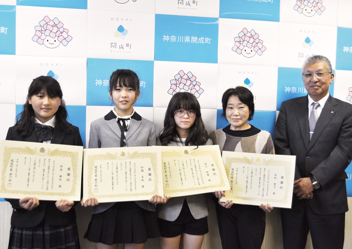 3月19日に開成町役場で行われた感謝状贈呈式には4人で出席。児童3人はこの日行われた卒業式後に参加した。