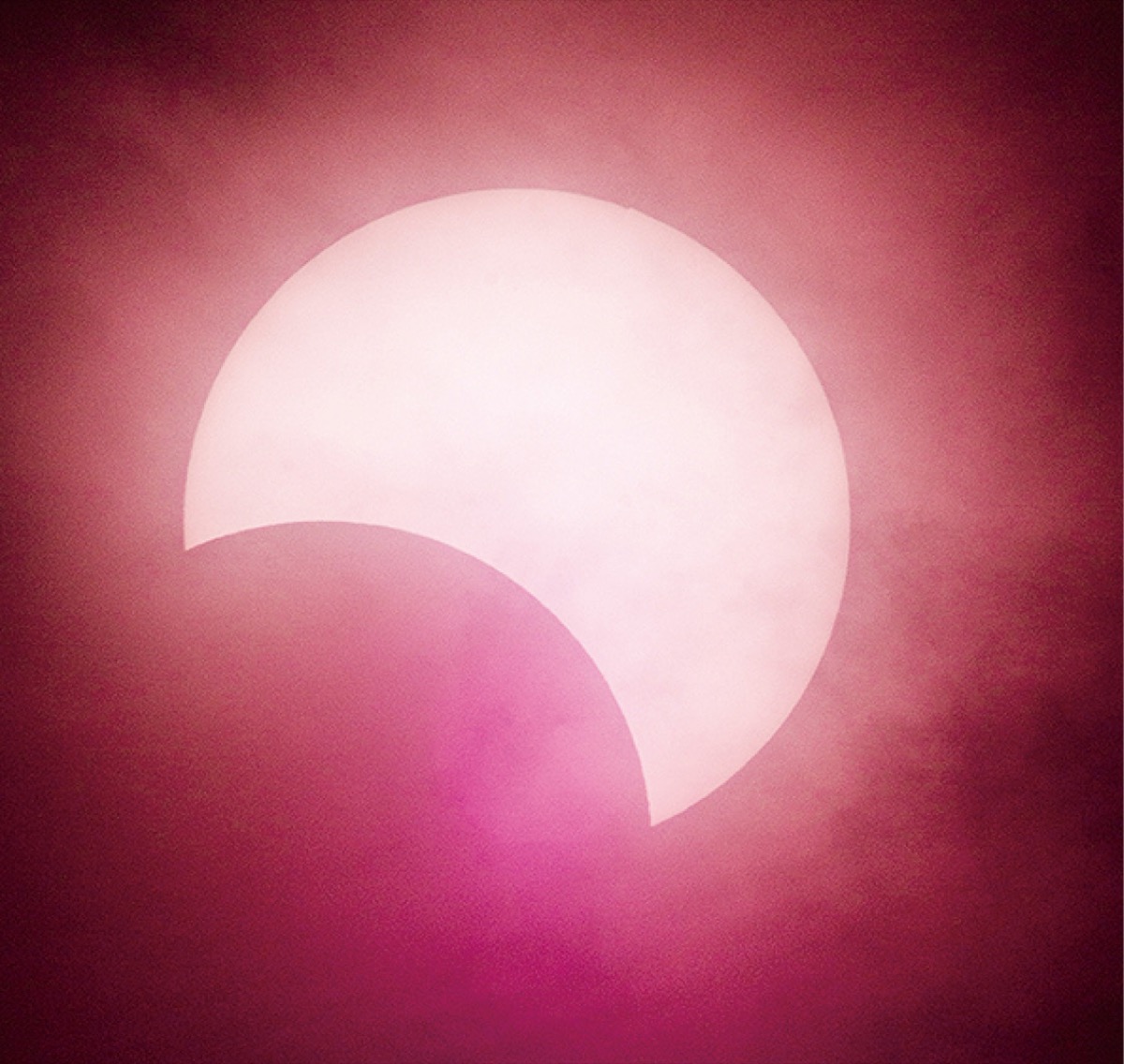 市内で写真教室を開く渋谷義一さん(67)は、教室で学ぶカメラ愛好家に呼びかけ撮影会を開いた。東京天文台によると日食は午後4時11分から6時3分までだが、この日は厚い雲がかかり観測しにくい空模様。参加者はファインダーをのぞきながらタイミングを待ち、雲の切れ間からの撮影に成功した。日食は5時10分が最大で太陽の面積の35・8%が黒く欠けた。
