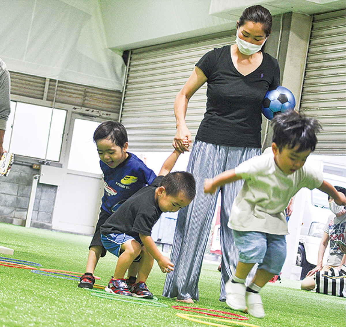 当日は年少、年中・年長、小学生低学年クラスに分かれ、全体で約40人が参加。コーチらのかけ声に合わせて障害物の間を走ってくぐり抜けたり、ボールを使った遊びをしながら動き回った。