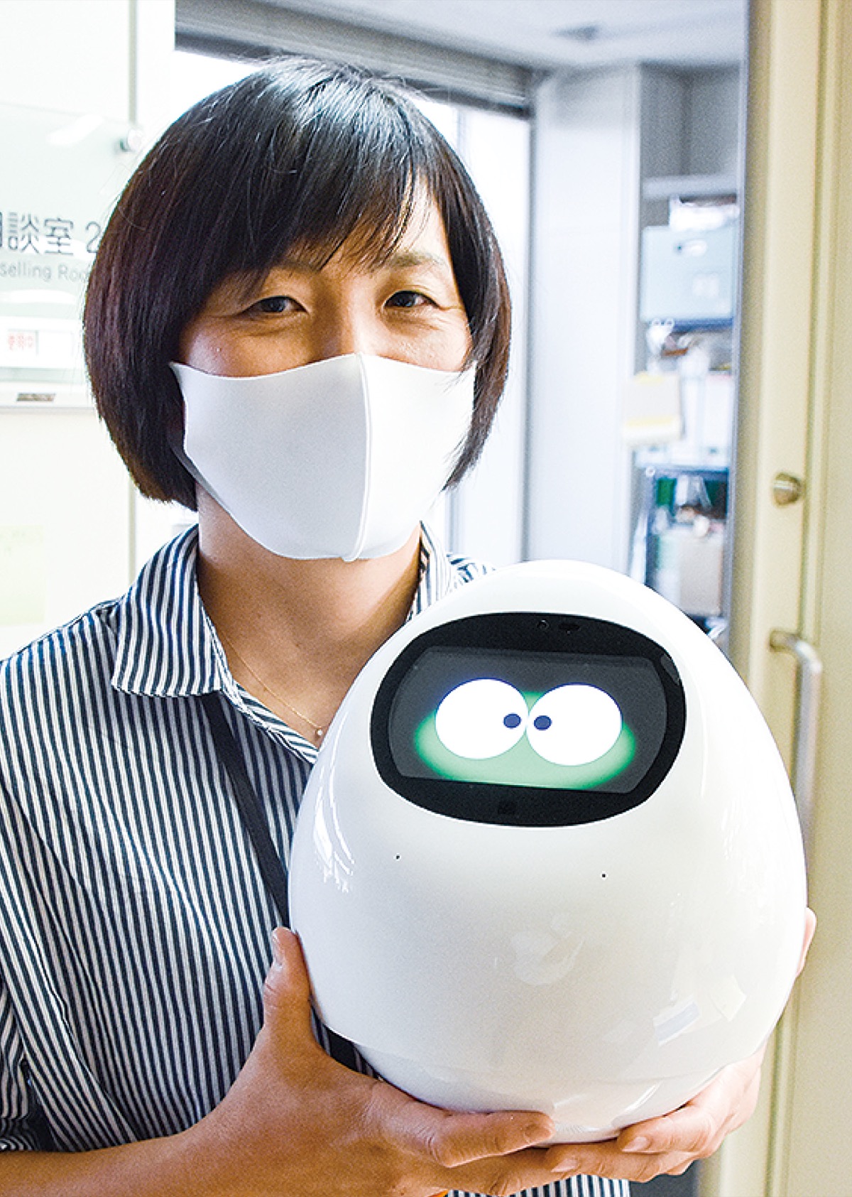株式会社MJI(東京都)が企画・販売するロボットで、大きさは縦24・5cm、横21cm。目の部分がタッチパネル式になっていて、呼び掛けると返事をする機能等を備える。その日の天気を教えてくれたり、音楽を流してくれたりもするという。提供される情報はインターネットを経由し随時更新される仕組みだ。