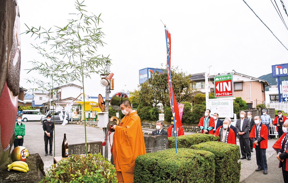石碑は1977年に、当時社長だった株式会社ヤオマサの田嶋享さんらが建立。近くに東名高速道路の大井松田インターチェンジがあるなど、当時は交通事故の多発地帯として住民らに恐れられており、ドライバーの目につくようにと今の場所に建てられた。