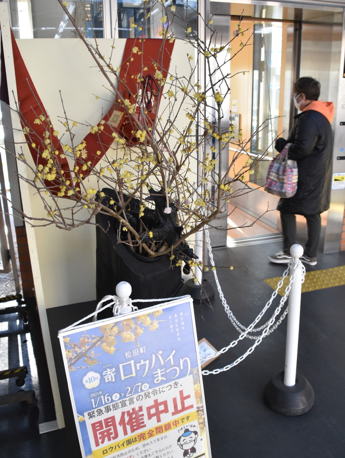 ロウバイは新松田駅のほか、小田原駅、小田原ダイナシティ、秦野駅、相模大野駅で2月3日まで展示される予定だ。