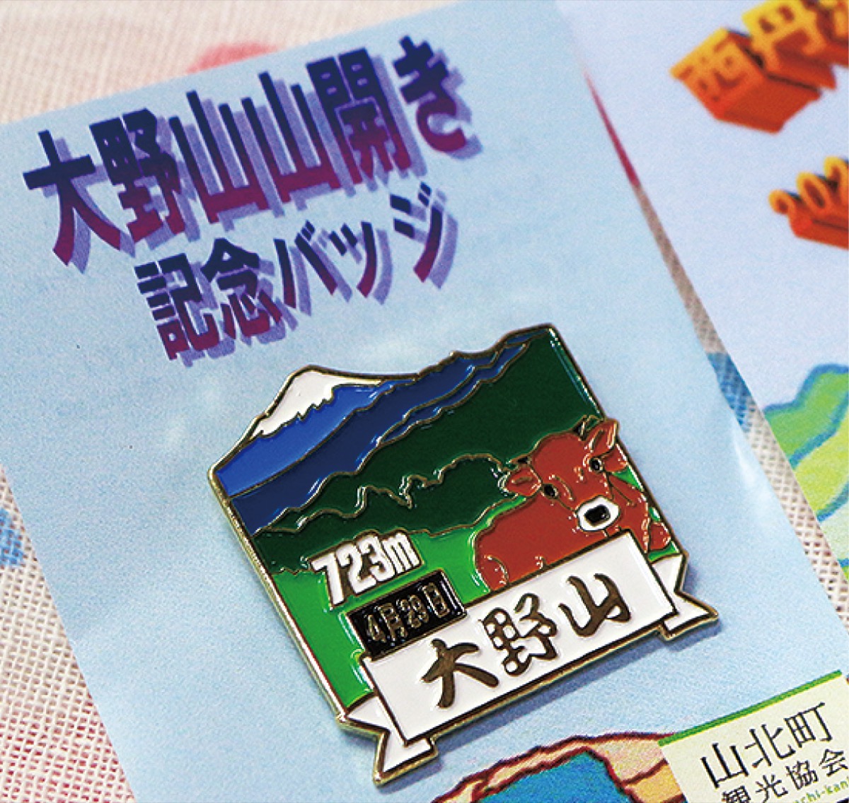 山北町の大野山山開きを記念したピンバッジがこのほど完成し、6月1日(火)から山北町観光協会で販売される=写真。価格は600円。