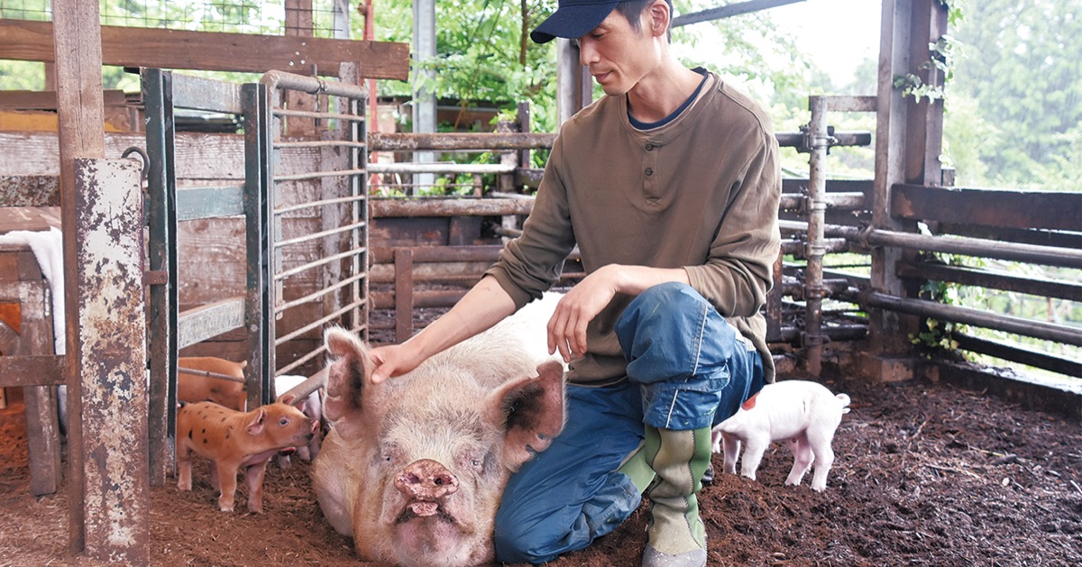 「農場こぶた畑」は、相原海さん(41)が2002年に始めた。豚の飼育から精肉の販売までを手掛けている。もともと動物が好きだった相原さん。将来の職業を模索する中、本来「産業廃棄物」として扱われる糠やおからといった素材を動物の餌に用いている養鶏場の取り組みや、地面に木くずを敷き糞尿をたい肥化する養豚場の飼育法等に面白さや可能性を感じ、自らも畜産を始めることにした。
