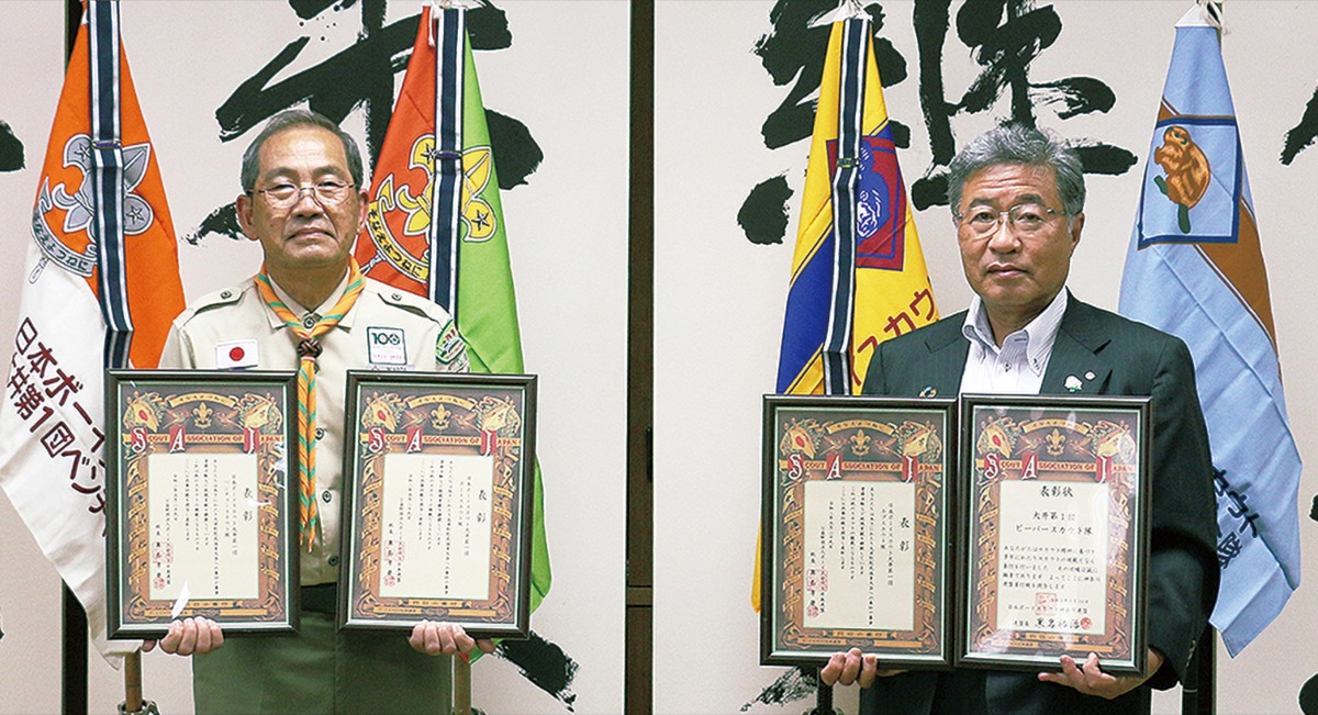大井町で活動する「ボーイスカウト大井第1団」がこのほど、長年に渡る社会奉仕活動の功績が認められ、ボーイスカウト日本連盟から公共奉仕綬、同神奈川連盟から善行綬をそれぞれ受章した。6月24日には町役場を訪れ、小田眞一町長に受章報告した。