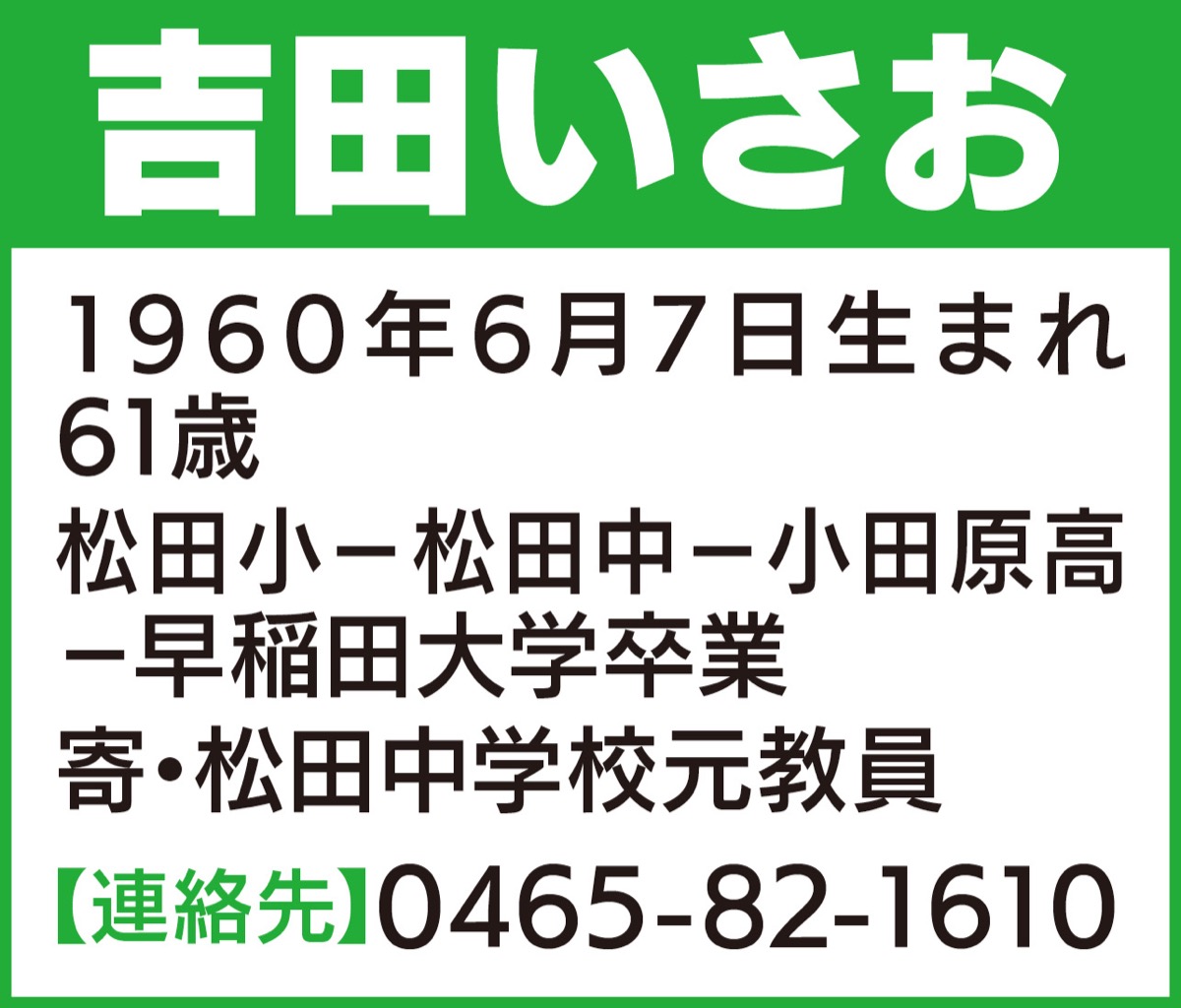 私は、町財政の不要な支出をおさえ、教育や福祉をたいせつにする「新たな松田づくり」に、全力で取り組みます。