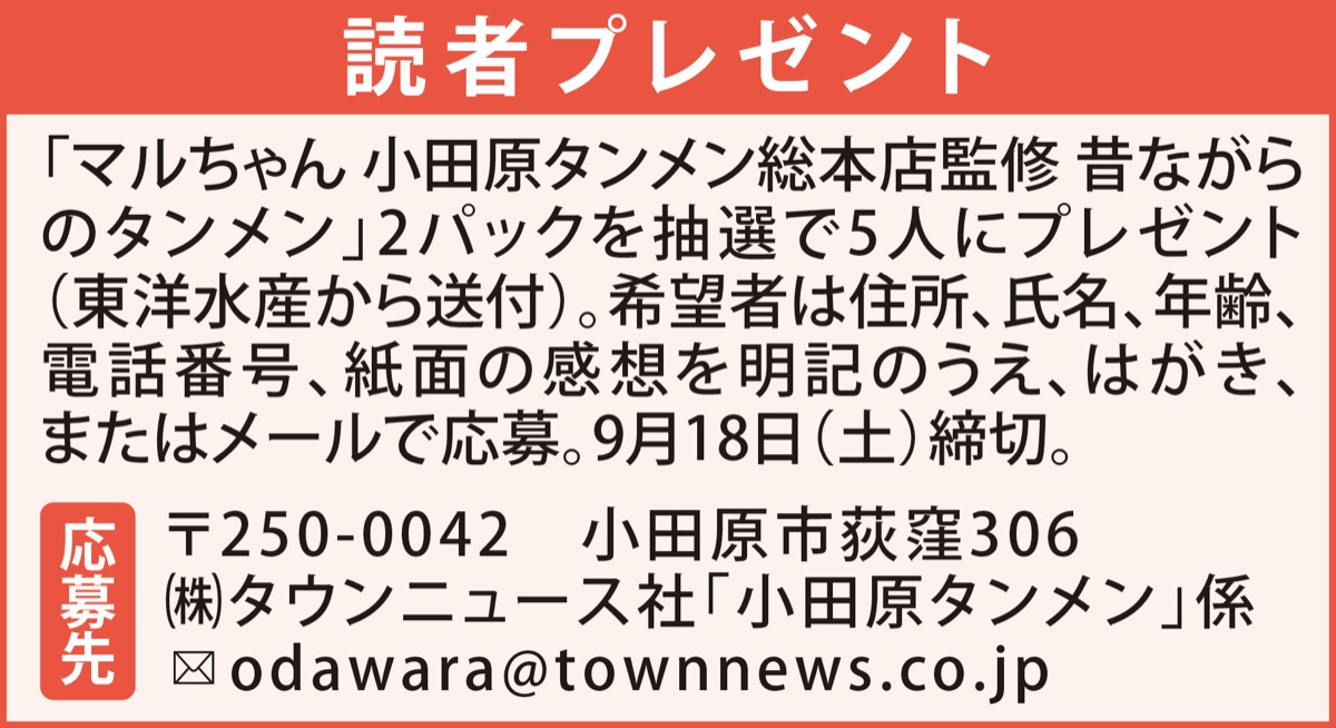 「マルちゃん」ブランドで知られる東洋水産(株)(東京都港区)と小田原タンメン総本店(小田原市東町)が協力して開発したチルド麺「マルちゃん 小田原タンメン総本店監修 昔ながらのタンメン」が9月1日から関東・静岡・中京地区で販売されている。