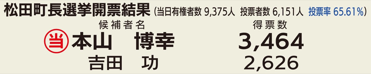 任期満了に伴う松田町長選挙は9月5日に投開票され、現職の本山博幸氏(51)が新人で元教員の吉田功氏(61)との一騎打ちを制し、3選を果たした。当日有権者数は9375人。投票率は65・61%で、過去最低だった前回を5・57ポイント上回った。