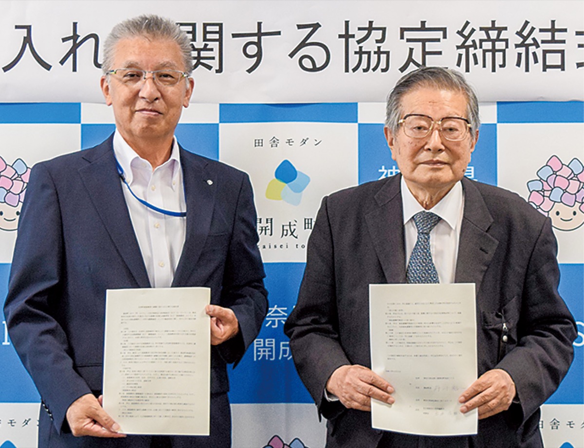 松本理事長は「公益的な取り組みの一環として私たちの役割を果たしていきたい」とあいさつ。府川裕一町長は「締結に感謝します。避難場所はまだ十分ではないので支援体制が整うようにしていきます」と話した。