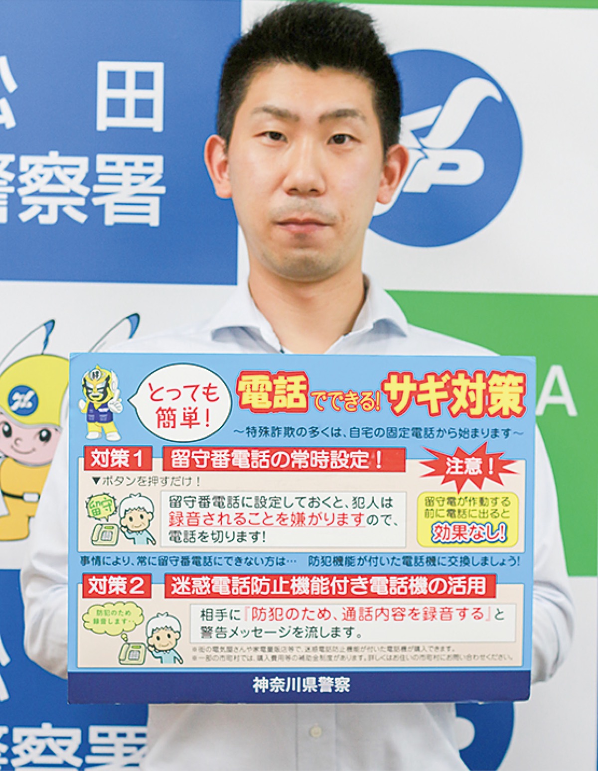 金銭面だけでなく、精神面、そして家族間の絆にまでも被害を与えるのが一向に無くならない「特殊詐欺」だ。松田署管内でも今年8月末までの段階で7件発生し、被害額は約1千万円にも上る。被害者はいずれも70代から90代の高齢者。その手口も【1】「インターネットの利用料金が未納」といった架空請求【2】息子になりすました犯人から電話があり「仕事に失敗して金が必要になった」というオレオレ詐欺【3】警察官などと身分を偽って家を訪れ「キャッシュカードが不正利用されているから封印が必要」などとして受け取り、偽物のカードをすり替えるといった職権盗【4】警察官を名乗り「不正利用があるからキャッシュカードの確認と取り換えが必要」などと言って、カードと暗証番号を盗みとる預貯金詐欺などさまざま。生活安全課の楠本和弘警部補は「騙しに使う設定にはバリエーションがある。被害にあった人も詐欺には気を付けていたという人ばかり。話を聞いたら信じ込ませられるので、聞かないのが一番」と話す。