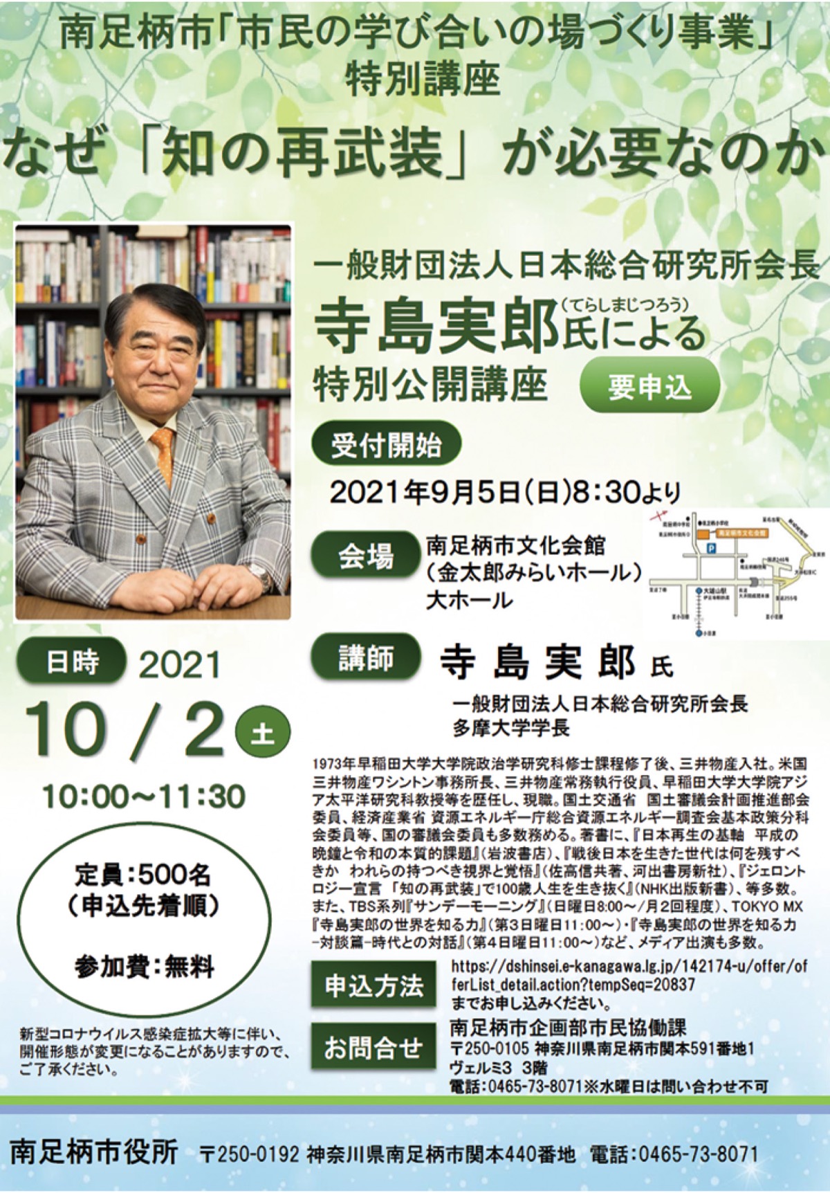 TBS系列「サンデーモーニング」などでおなじみの寺島実郎さん(一般財団法人日本総合研究所会長、多摩大学学長)による特別公開講座が10月2日(土)、南足柄市文化会館で開かれる。午前10時から11時半。事前申し込み制、参加費無料。
