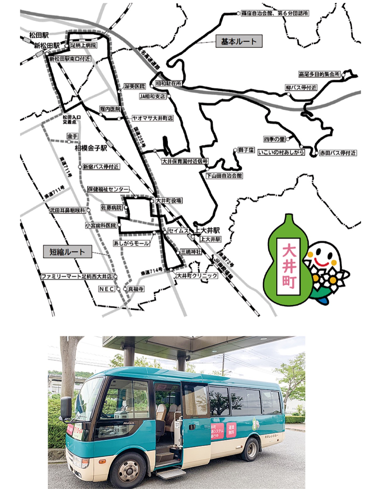 同バスは、路線バスと同様に予め運行ルート、停留所、運行時間が定められている。ルートは大井町役場・いこいの村あしがら・ヤオマサ大井町店などを走る「基本ルート」と大井町クリニック・武田耳鼻咽喉科・足柄上病院など利用の多いバス停や店舗、病院・医院、公共施設などを連絡する「短縮ルート」の2系統がある。利用は誰でも可能で、運賃は無料(2022年度から有料)。町の担当者は「土曜日は平日より少ない便での運行となります。詳細はホームページで確認してほしい」と呼び掛けている。