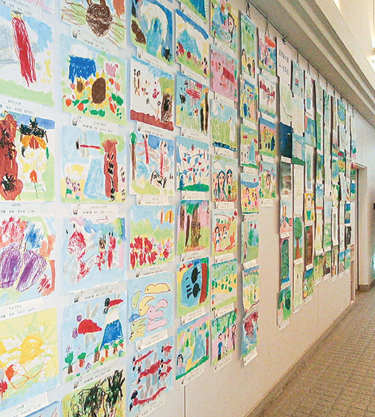 大井町生涯学習センターロビーで、小学生以下の子どもを対象に行われた「こども絵画展」の作品が展示されている=写真。