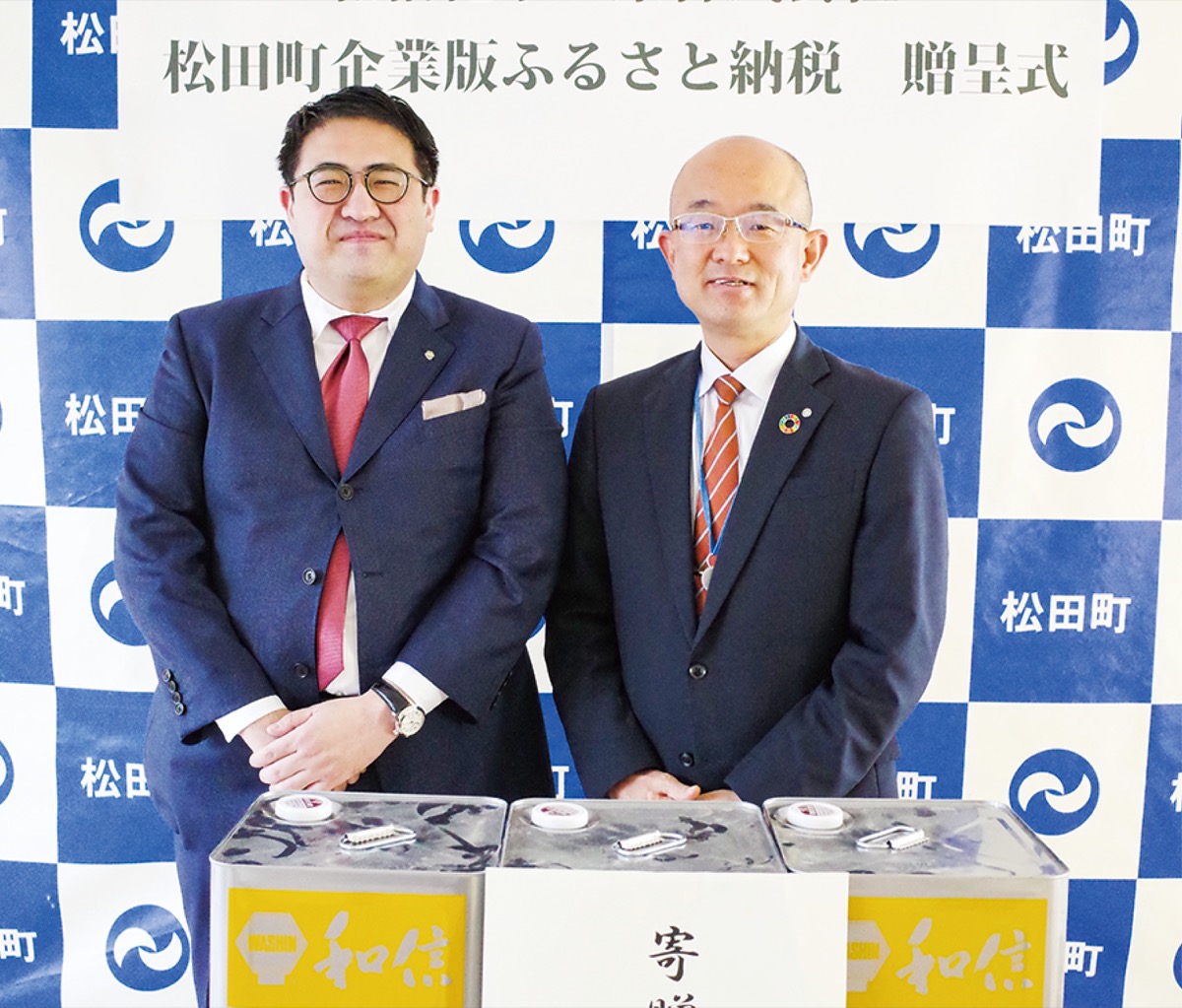 同社は松田小学校建設事業に対し300万円(うち120万8200円は工事で使用する塗料)を寄付した。同制度を利用した寄付は町で2例目だといい、贈呈式で本山博幸町長は「塗料は子どもたちが直接触れる場所に使われるので、健康面や衛生面、そして建物の維持面でも重要であり、感謝します。新しい学び舎の子どもたちと一緒にいい色に育ってほしい」と感謝を述べた。