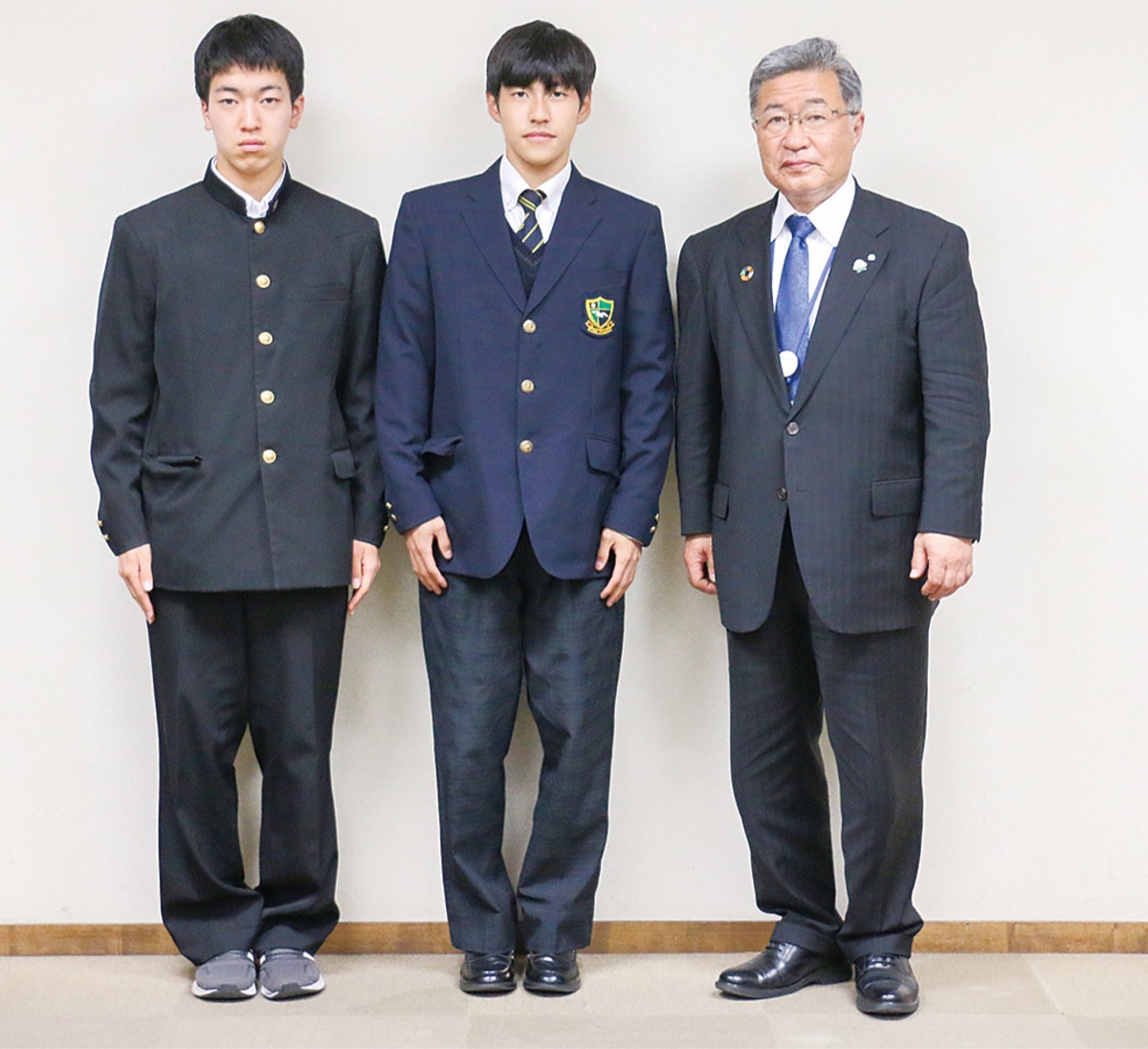 第74回神奈川県高等学校駅伝競走大会(11月7日・日産スタジアム)に出場した大井町立湘光中出身の可児悠貴さん(東海大相模2年)と曽根直也さん(鎌倉学園3年)が11月24日、大井町役場を訪れ小田眞一町長を表敬訪問した。