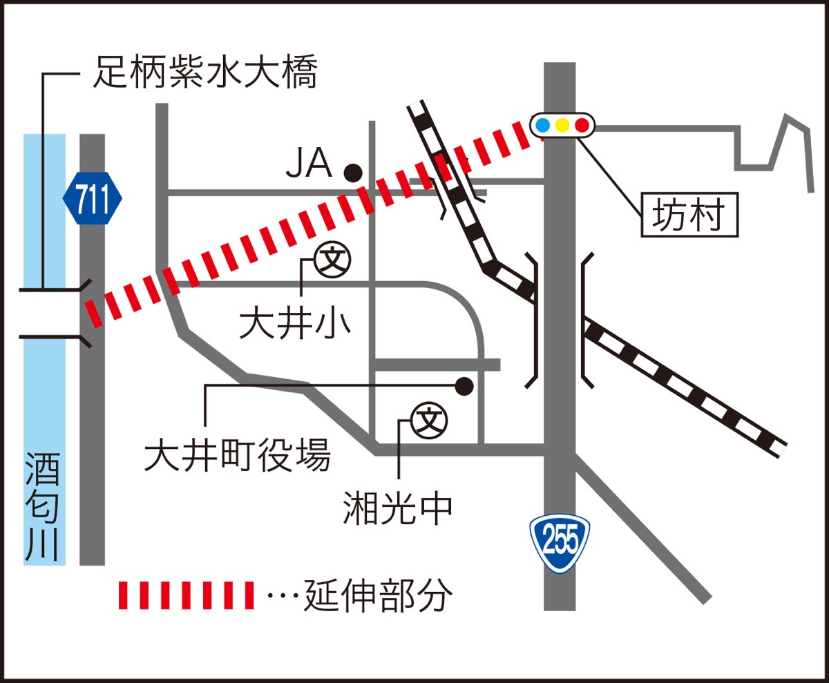 大井町と開成町を結ぶ足柄紫水大橋が2014年に完成して以来、県道711号から国道255号につながる道路の整備が待たれていた。