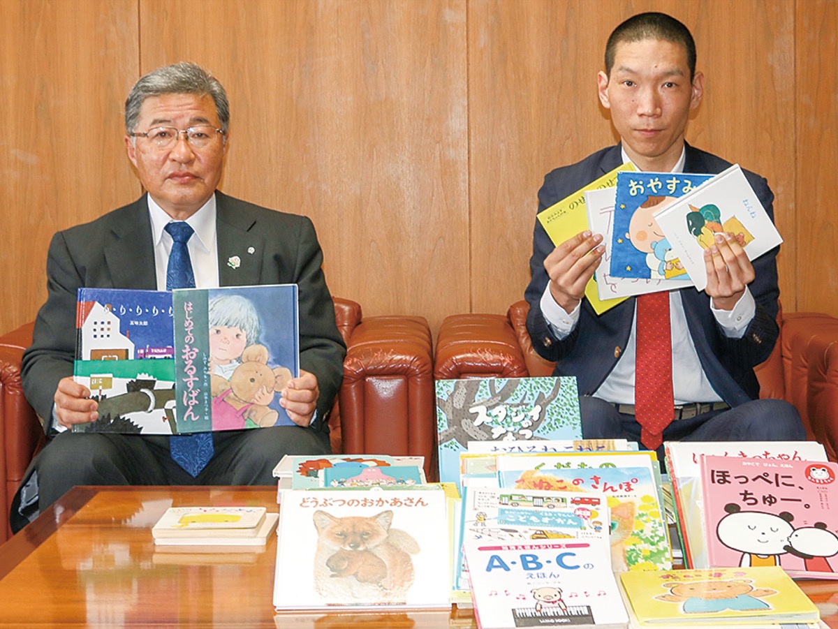 絵本は、0歳児から2歳児向けの読み聞かせに使われるもので、SDGs推進のため全てリユース品となっている。沢村社長は「今後も継続していきたい。町と連携し事業展開ができれば」と話し、小田町長は「子育て支援に力を入れているので大変ありがたい」と感謝した。