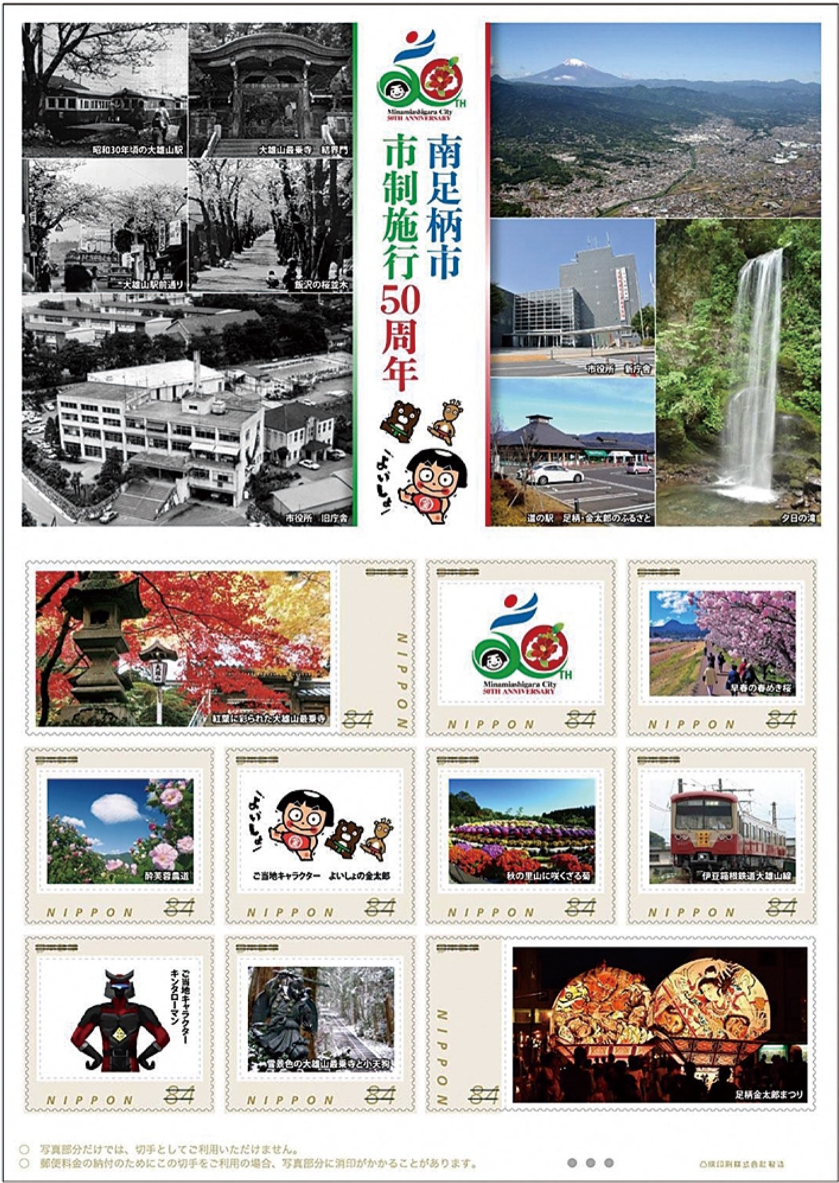 日本郵便(株)南関東支社の協力で作られた今回の切手シート。1シートは84円切手10枚からなる。大雄山最乗寺の紅葉、市制50周年記念ロゴマーク、早春の春めき桜、伊豆箱根鉄道大雄山線、秋の里山に咲くざる菊、酔芙蓉農道、雪景色の大雄山最乗寺と小天狗、足柄金太郎まつり、ご当地キャラクターよいしょ君、キンタローマンがデザインされている。