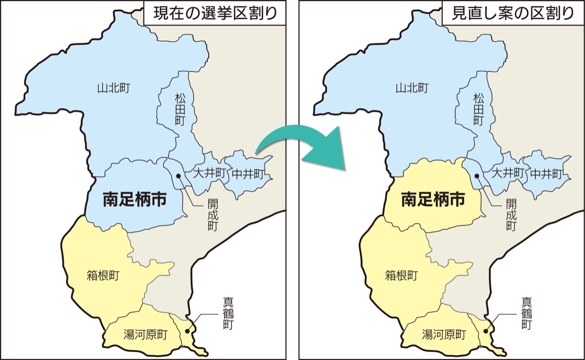 足柄下選挙区との合区を巡っては、南足柄市、同市議会、足柄上郡5町首長のそれぞれが県議会議長、委員長などに宛て、行政区域や生活圏の一体性がないこと、すでに足柄上地域1市5町で広域行政を展開していることなどを理由に「断固反対」とする要望書を提出していたが、方向性は変わらなかった。