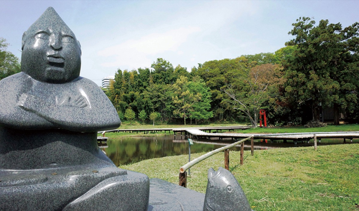 中央でひと際存在感がある厳島神社は、町教育委員会の案内板によれば1807年に建てられています。その後数度の改築を経て、現在の姿に。ちなみに江戸時代は弁天様と呼ばれていましたが、1869年に厳島神社と改名されたそうです。周囲は清水が豊富に湧き出ていて、ホタルやシマドジョウなど、清く澄んだ水にしかいない小動物も生息しているとのこと。そうそう、水の妖精も湿地の端の方に鎮座しておりました。
