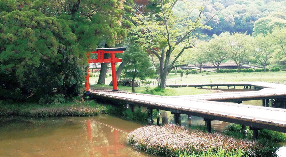 勝手な思い込みですが、公園って、いかにも公園に続きそうな大きな道の先にあるイメージだったので、初心者の私は住宅街を抜けて突然現れたこの空間にびっくりしました。広いし、緑もいっぱい。周囲を水に囲まれた厳島神社、湿地を縫うように走る木道、真竹林、芝生広場―、なんか空間としての特別感がスゴイです。家の近所にこんな公園ある人、うらやましいな…。