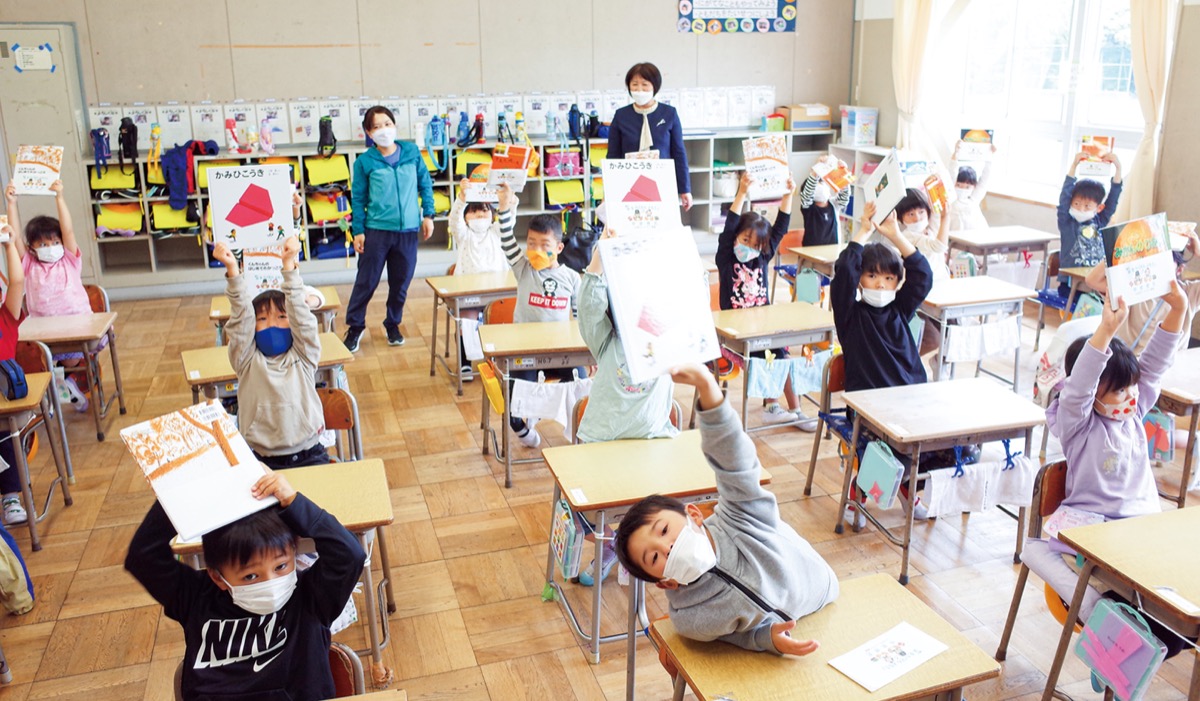 山北町立川村小学校(大越泰子校長)で4月28日、町から1年生児童に絵本がプレゼントされた=写真。心を育み、生きる力となる読書習慣を定着させようとするブックスタート事業の一環。