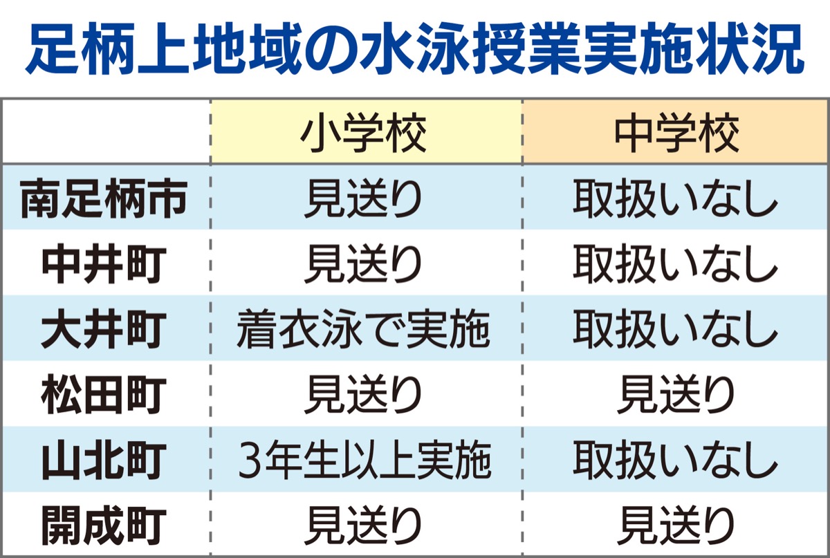 南足柄市と中井町、松田町、開成町の1市3町の小学校11校で水泳授業の実施が3年連続で見送られた。