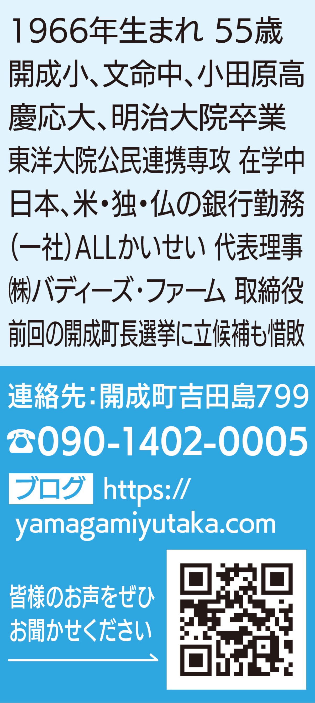 熊本県球磨川の水害では、家の2階へ避難された方も、家ごと流され、命をおとしました。開成町でも、浸水想定が3mを超える地域が一部にあります。教訓に習えば、町内外に、車等で一時避難する場所を確保する必要があります。